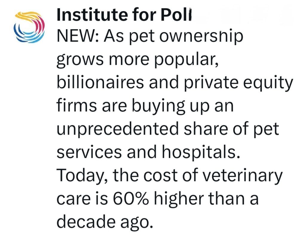 “Pet food and veterinary care costs have skyrocketed,” he says. “That’s because billionaire-backed investment firms are buying up what used to be mom-and-pop clinics and pet food brands. The Mars family, the candy makers, now controls much of the pet food industry. They’re squeezing profits from places where we don’t have a choice.”