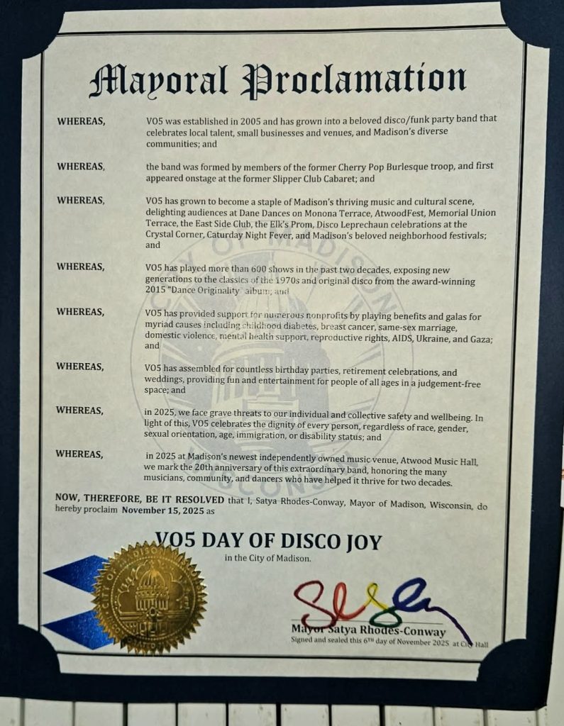 Mayor Satya Rhodes-Conway declared November 15th “VO5 Day of Disco Joy” encouraging fans to celebrate by listening to the band’s music.