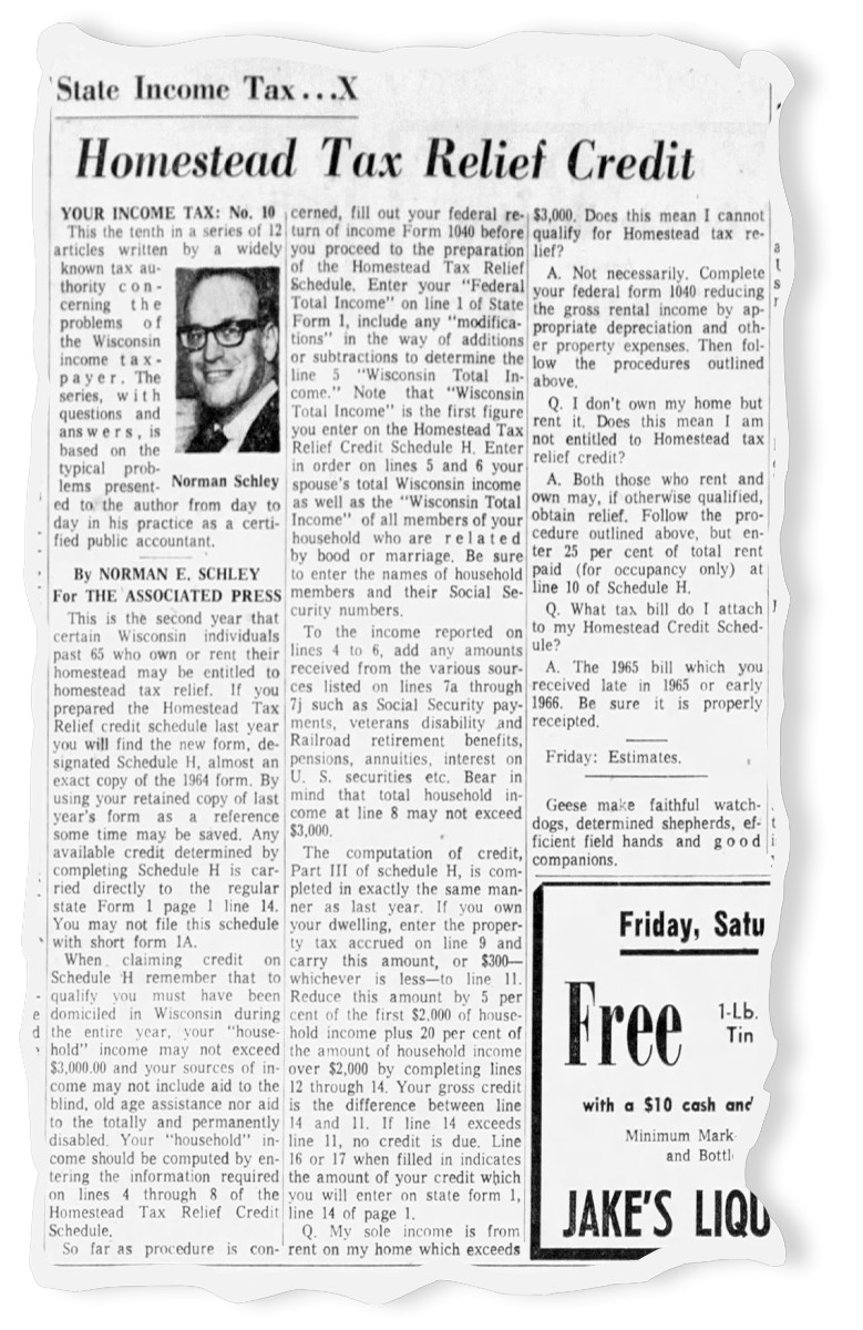 An AP story on the homestead tax credit as published in The Sheboygan Press, Jan. 20, 1966.