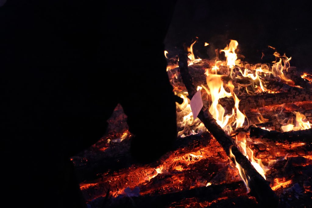 Then organizers in florescent vests set a carefully-stacked pile of Christmas trees ablaze. As the roaring flame died down, participants set about tossing their secrets into the blaze.