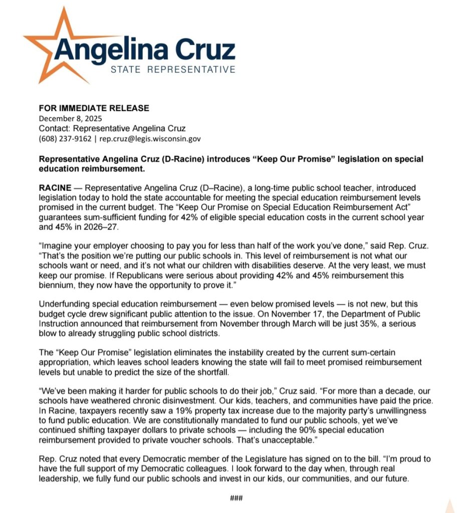 Rep. Angelina Cruz is a former public school teacher and says new estimates from the Department of Public Instruction (DPI) indicates districts will receive roughly 35% reimbursement for special education costs. That’s despite lawmakers approving a 42% reimbursement rate this year and 45% next year in the biennial budget.