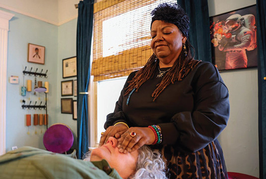 Angela Smith performs Reiki on Heather Asiyanbi at The Zen Dragonfly. (Photo by Jonathan Aguilar / Milwaukee Neighborhood News Service / CatchLight Local)