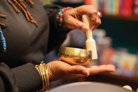 Angela Smith plays a sound bowl at The Zen Dragonfly. (Photo by Jonathan Aguilar / Milwaukee Neighborhood News Service / CatchLight Local)